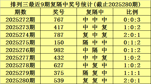 上期追思:陈列三第2025280期奖号为:539。大小比为2:1,奇偶比为3:0,012路比为2:0:1。